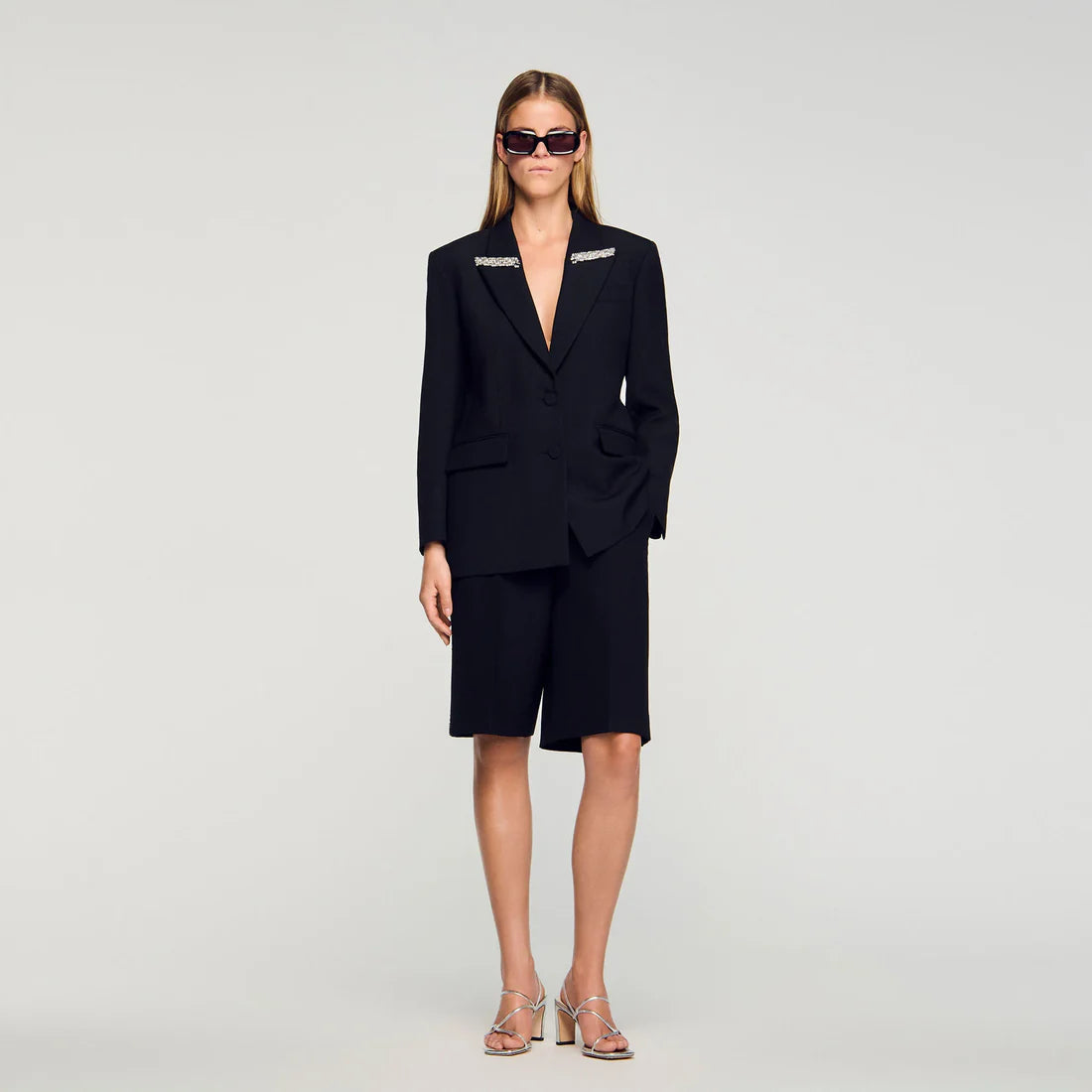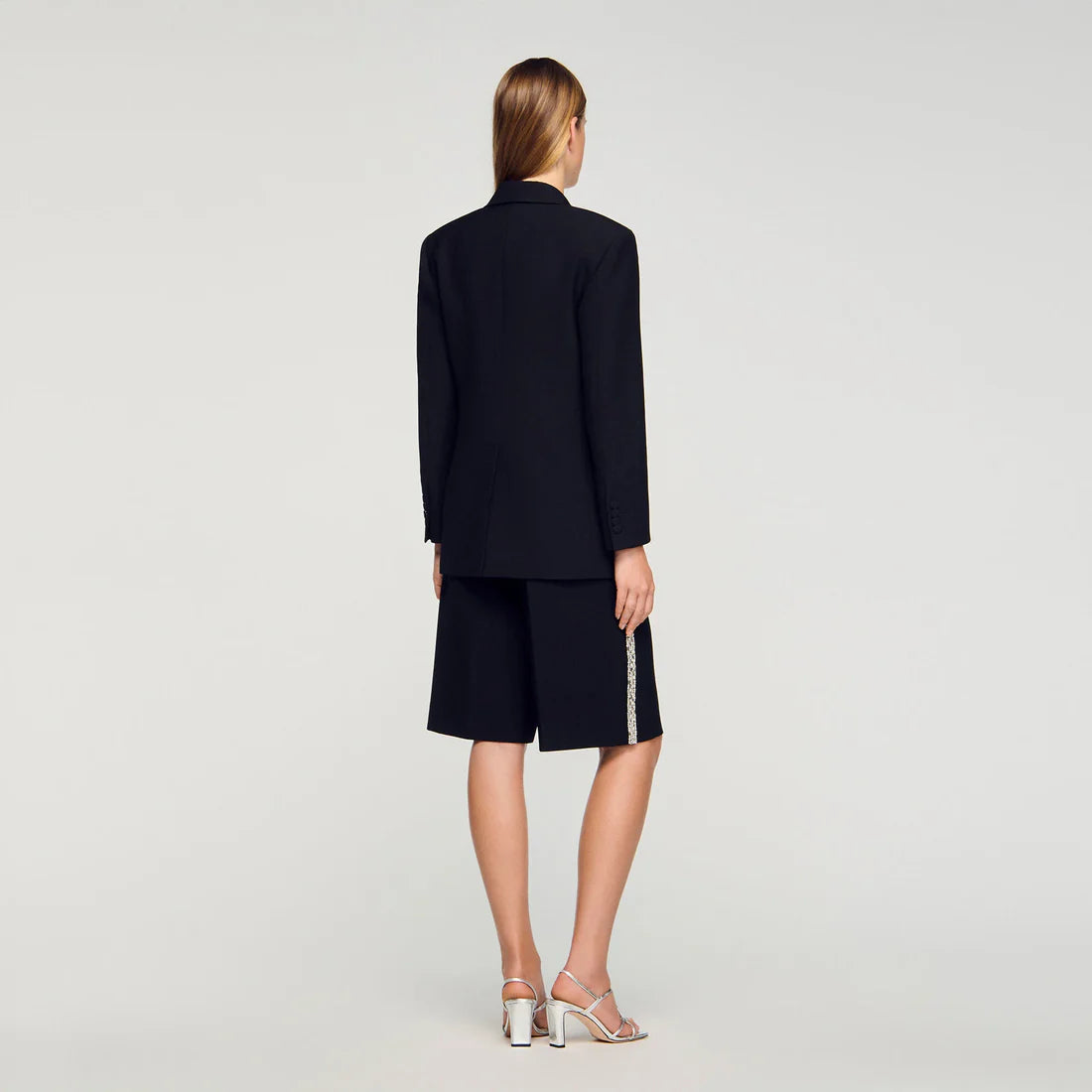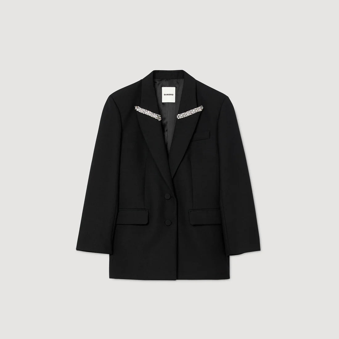 سترة توكسيدو مع ياقة من الساتان مزينة بأحجار الراين، تتميز بأكمام طويلة وجيوب ذات غطاء.