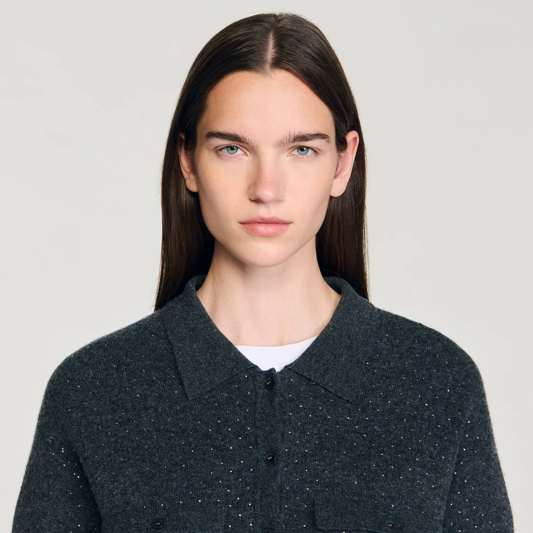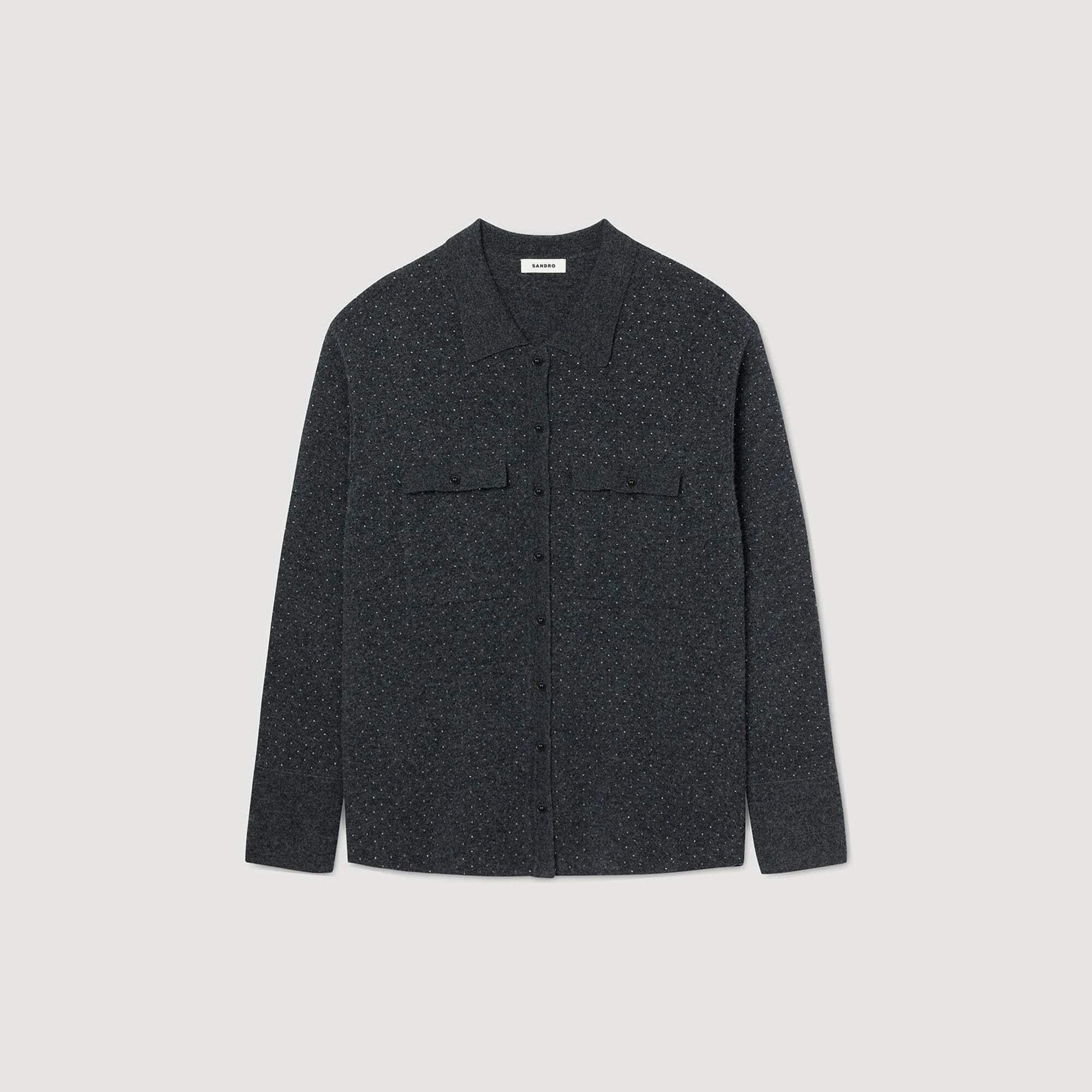 Long shirt-style cardigan with strass, featuring a shirt collar, long sleeves and a button placket fastening.